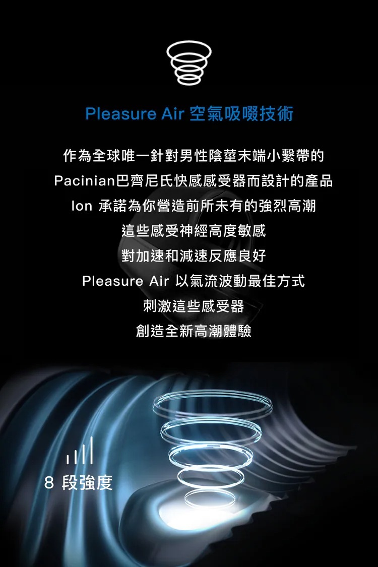 Arcwave Ion 2 搭載專利 Pleasure Air™ 技術,透過脈動氣流震動刺激陰莖繫帶上的巴齊尼氏(Pacinian)快感感受器。這項技術不同於傳統自慰器的物理摩擦,而是利用氣壓變化進行無接觸式吸吮與撥弄,帶來更深層、更強烈的快感,號稱能讓男性體驗類似女性高潮的持久與震撼感受。Ion 2 提供 8 段吸啜強度,讓用戶可根據喜好自由調整,從溫和到強烈皆能滿足。