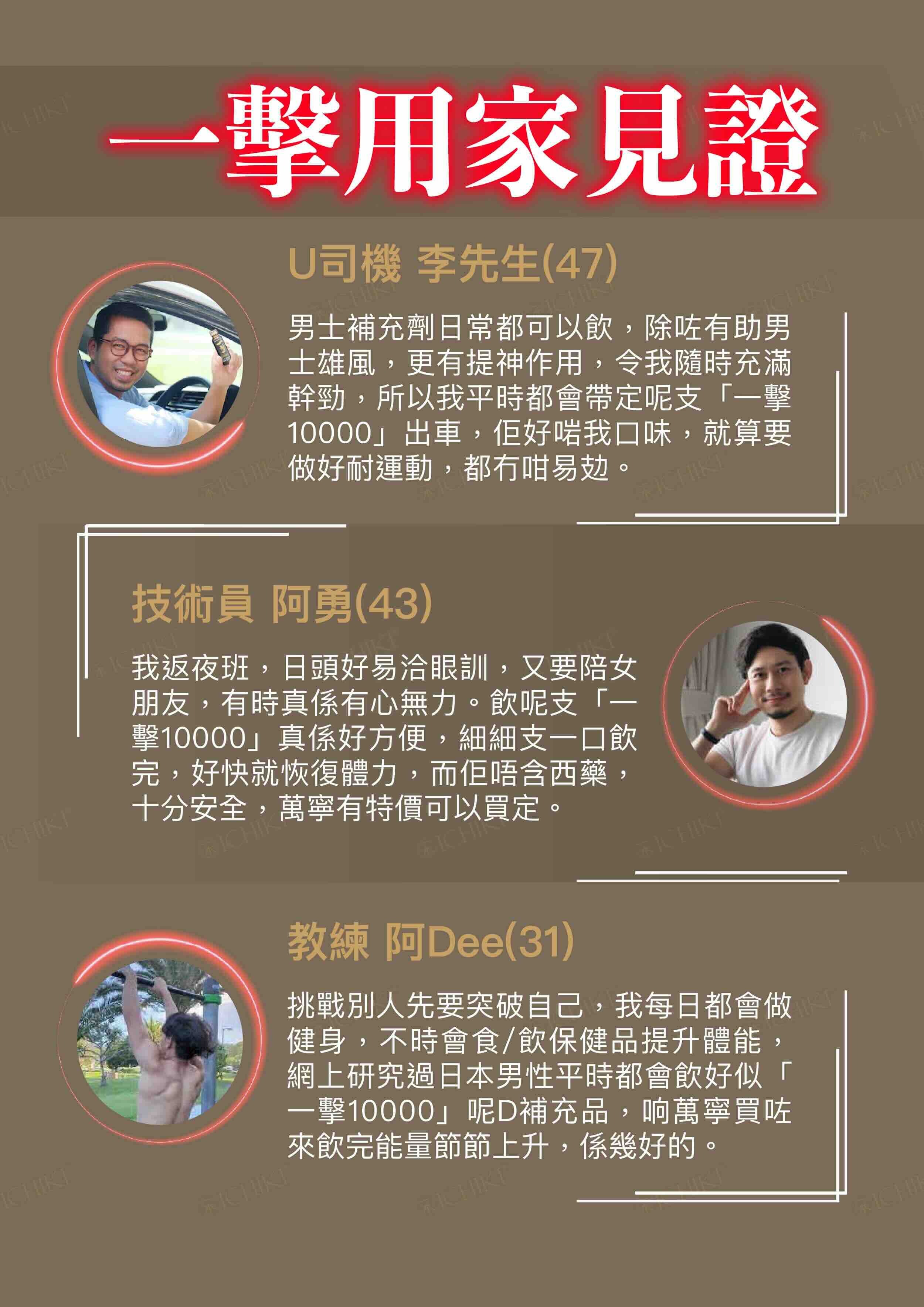 一擊10000 含有相等於10,000毫克南美產瑪卡和黑瑪卡,配方專為東方男士研製,每日1支令男士充滿自信,為每晚加添快感!