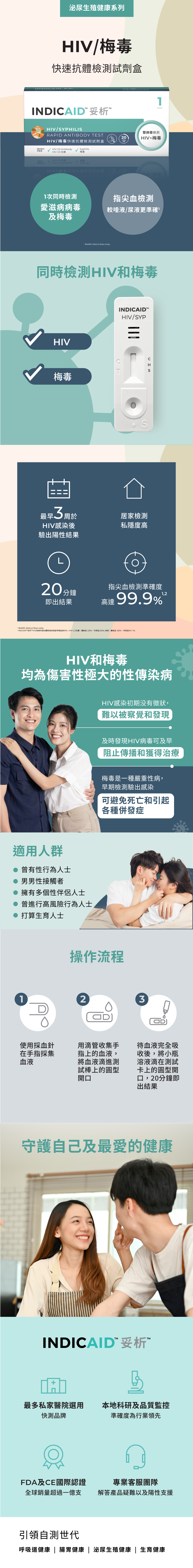 幫你快測常見5款性病,INDICAID™妥析™ HIV/梅毒快速抗體檢測試劑盒可以在再三確認結果 或 最快空窗期3星期測試HIV!