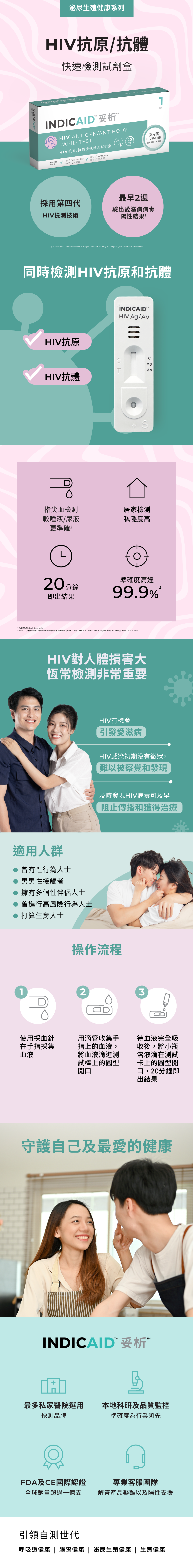 INDICAID妥析 HIV 抗原/抗體快速檢測試劑盒採用第四代 HIV 快速檢測技術,能夠更早、更準確地檢測出 HIV 病菌。