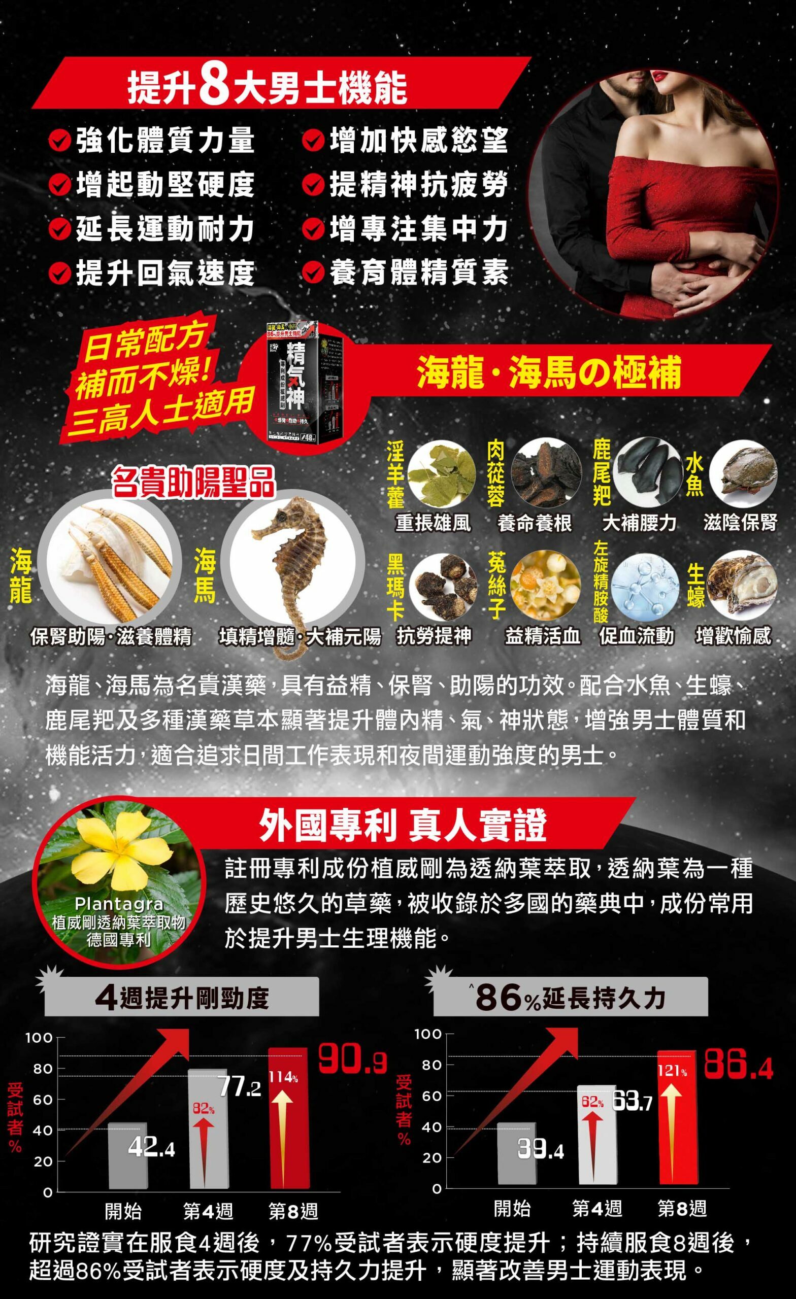 日本研發配方樂道新產品「精氣神」 主要成份為海馬和海龍及多種漢方精製而成大補丸,特別加入外國註冊專利成份植威剛(透納葉萃取)增強男士機能。