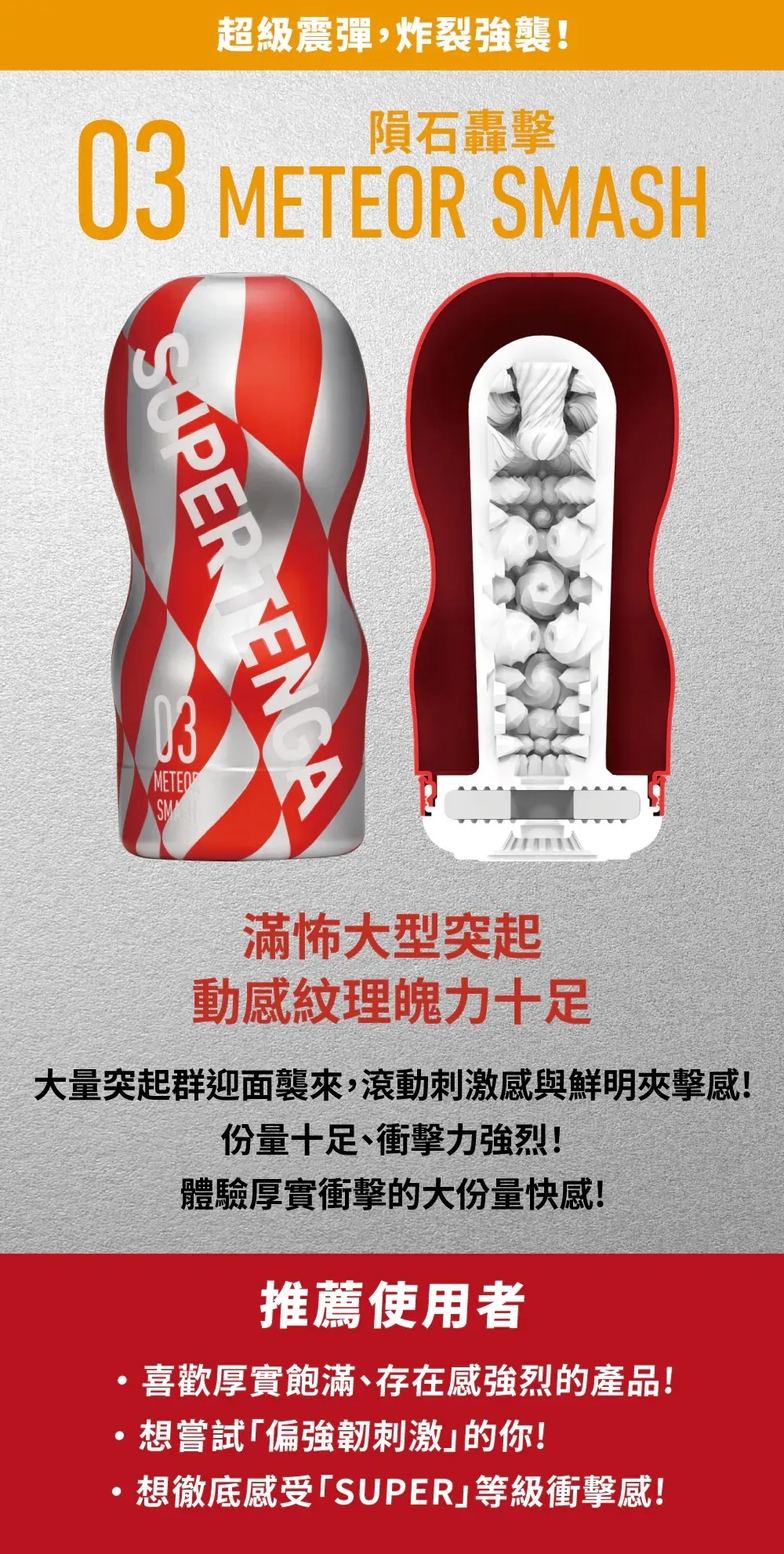 日本TENGA最新進化系列 SUPER TENGA,帶來史上最強壓迫衝擊快感!比經典紅杯更大、更厚實。SUPER TENGA-03 METEOR SMASH 隕石轟擊內部採用大型突起密集「超級凸點」結構,宛如無數隕石從天而降,猛烈撞擊、全面碾壓根部到龜頭,帶來「面ごと押しつぶす」般的容赦ないボリューム刺激與極致高潮。TENGA品牌自2005年以來不斷革新,這次SUPER系列讓你體驗「TENGAを超えるTENGA」的終極過激享受!